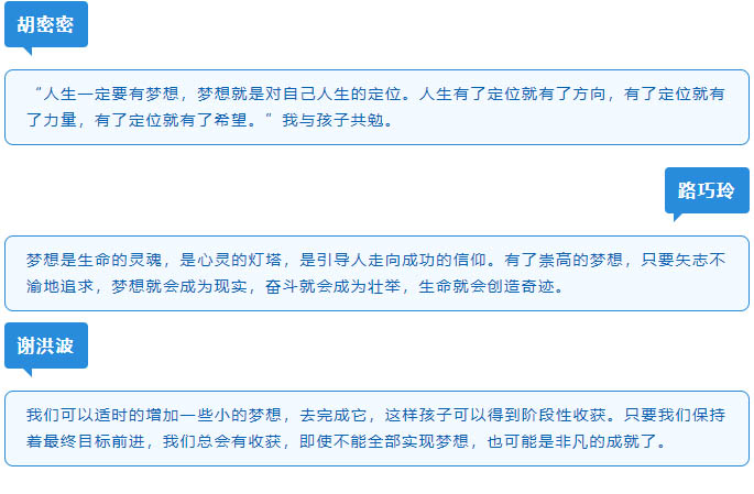 父母是孩子的人生第一導(dǎo)師,是呵護夢想的第一責(zé)任人,夢想教育應(yīng)該是父母與孩子共同完成的工作。這就要求家長首先要學(xué)會傾聽,放寬對孩子的約束,多和孩子平等地交流,不急于表態(tài),不急于肯定和否定。